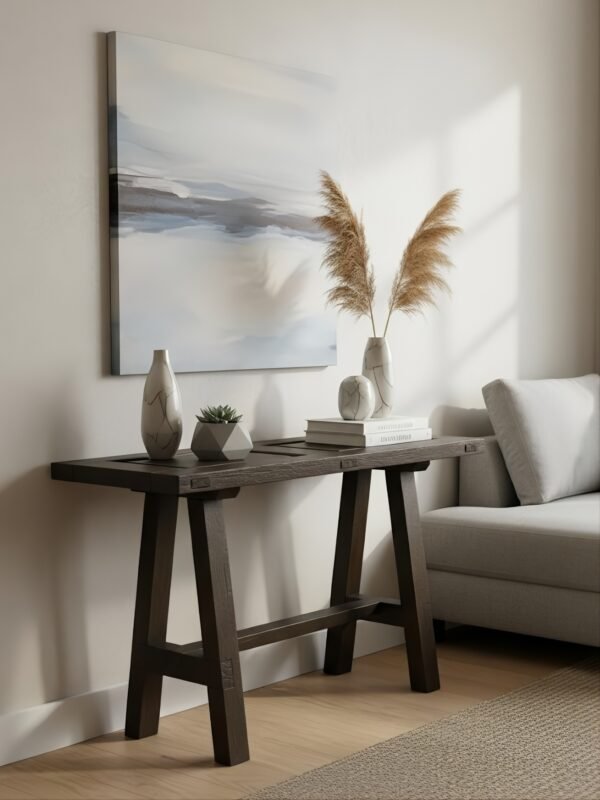 De líneas sencillas y funcionales, con una base tipo caballete o travesaño (trestle) que le otorga gran estabilidad. El diseño es atemporal y se adapta a múltiples estilos, desde el rústico hasta el colonial o incluso moderno-minimalista. La parte superior presenta una puerta antigua, un detalle que rompe la simplicidad y añade un toque artesanal. Las patas en forma de ‘A’ o caballete están conectadas por un travesaño central (o «H» en la base) para máxima durabilidad. Las uniones (posiblemente con espigas o visibles) refuerzan su carácter artesanal.