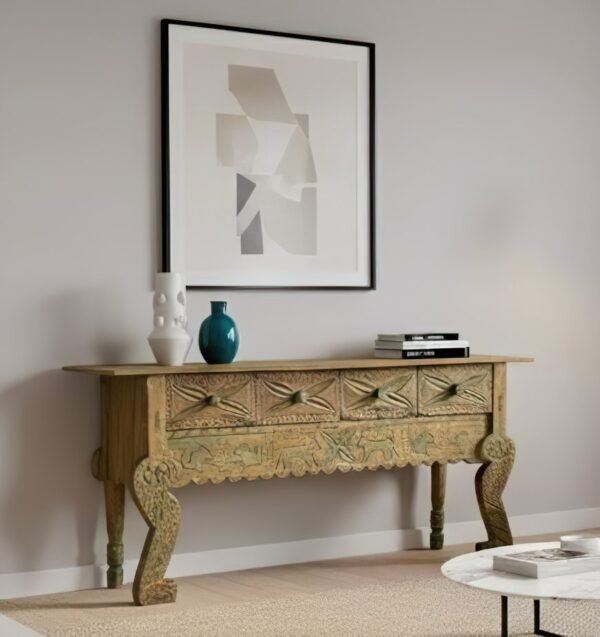 Origen y Estilo: Origen artesanal, de tradición popular guatemalteca, caracterizada por un estilo folk art o rústico. Destaca por su acabado rústico y su paleta de colores patinados. Cuenta con cuatro cajones frontales, cada uno decorado con una gran talla floral, geométrica o de roseta, que funciona como tirador.