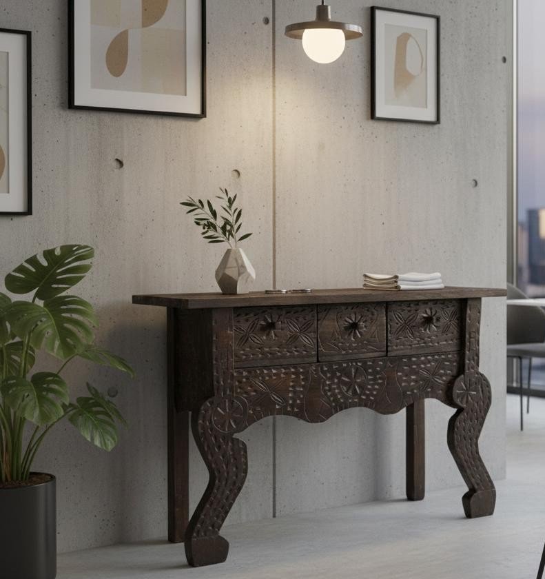 C21-5 Consola rústica en Madera Tallada 3 cajones