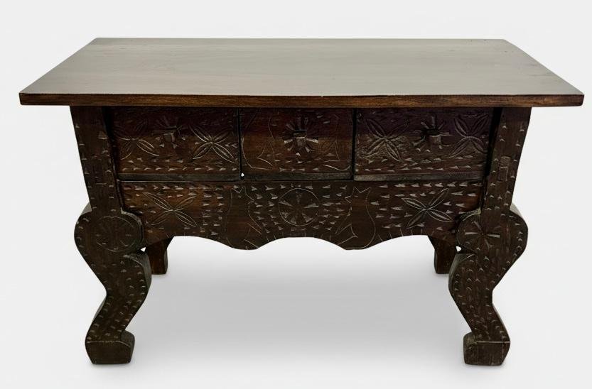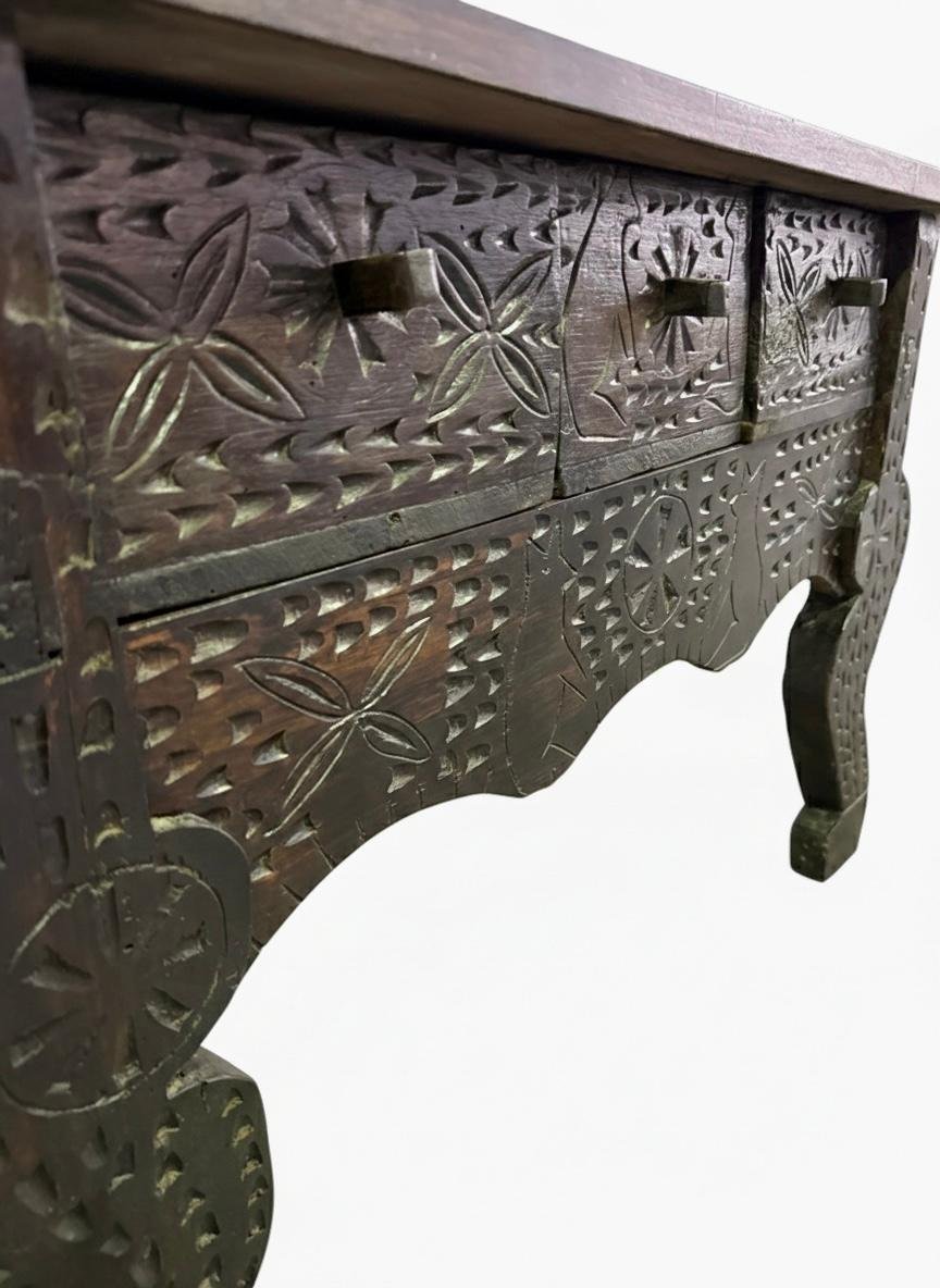 El frontal se divide en tres cajones decorados con motivos florales radiantes (rosetas) y patrones geométricos incisos, rematados con tiradores de madera integrados. El faldón inferior presenta un perfil ondulado y calado, armonizando perfectamente con sus singulares patas de perfil curvo, también profusamente decoradas. Excelente estado de conservación, conservando la autenticidad de sus ensambles tradicionales.