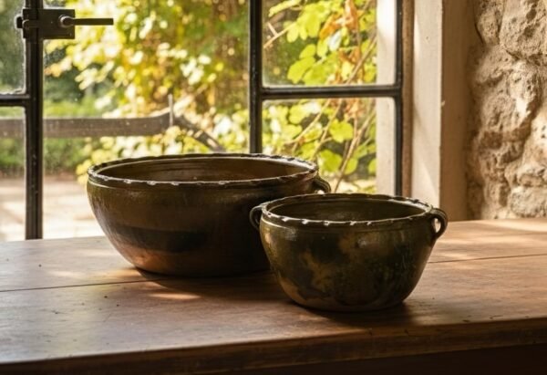 - Esmalte Rústico: Cubiertos con un esmalte en tonos profundos, principalmente verde oliva/marrón oscuro, aplicado de forma irregular, lo que crea variaciones de color y un aspecto vintage.