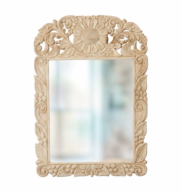 Marco Artesanal Único. El marco presenta un efecto tallado y envejecido que simula madera desgastada por el tiempo, con un acabado Wash/Decapé que resalta la veta y los matices claros. Las formas geométricas a lo largo del marco le dan una rica textura visual, capturando la luz de manera única y añadiendo carácter a cualquier pared.