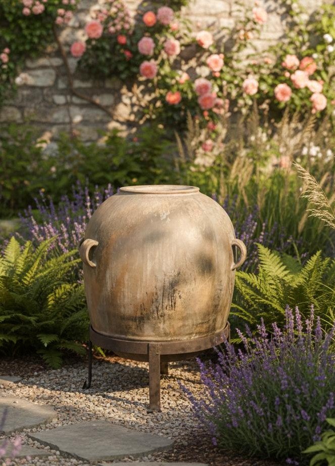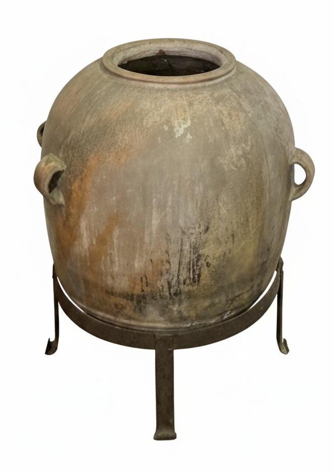 Esta pieza evoca la tradición mediterránea y la belleza de lo auténtico. Incluye una base de hierro forjado a medida que le otorga altura y una presencia escultural imponente. Presenta una superficie texturizada con matices orgánicos, manchas de humedad antiguas y desgastes naturales que narran su historia. Posee asas laterales robustas, características de las piezas de almacenamiento de época, que añaden equilibrio visual. Incluye una base de tres patas en hierro envejecido, diseñada específicamente para sostener la estructura circular de la tinaja con total estabilidad. Perfecta para quienes buscan la «belleza de la imperfección» en espacios modernos o rústicos.