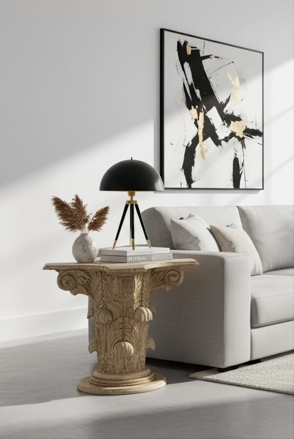 Majestuosidad Clásica con Acabado Washed. Este impresionante pedestal decorativo es una pieza escultórica que transforma cualquier espacio. Su diseño se inspira directamente en el Capitel Corintio, uno de los órdenes arquitectónicos más ornamentados de la antigüedad, capturando su grandeza en un formato funcional.