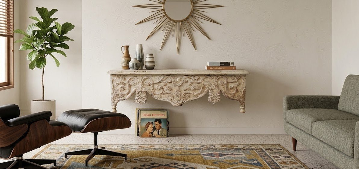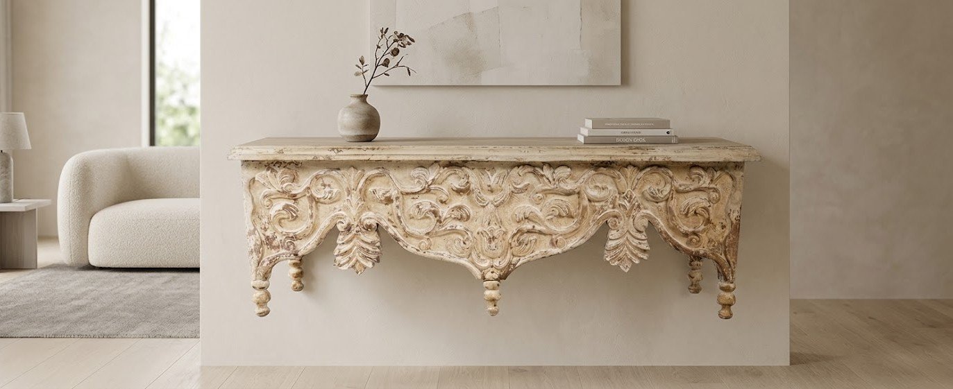 Por qué funciona: La pátina clara suaviza la robustez de la madera tallada, permitiendo que encaje en paredes de tonos arena, piedra o blanco roto sin saturar el ambiente.