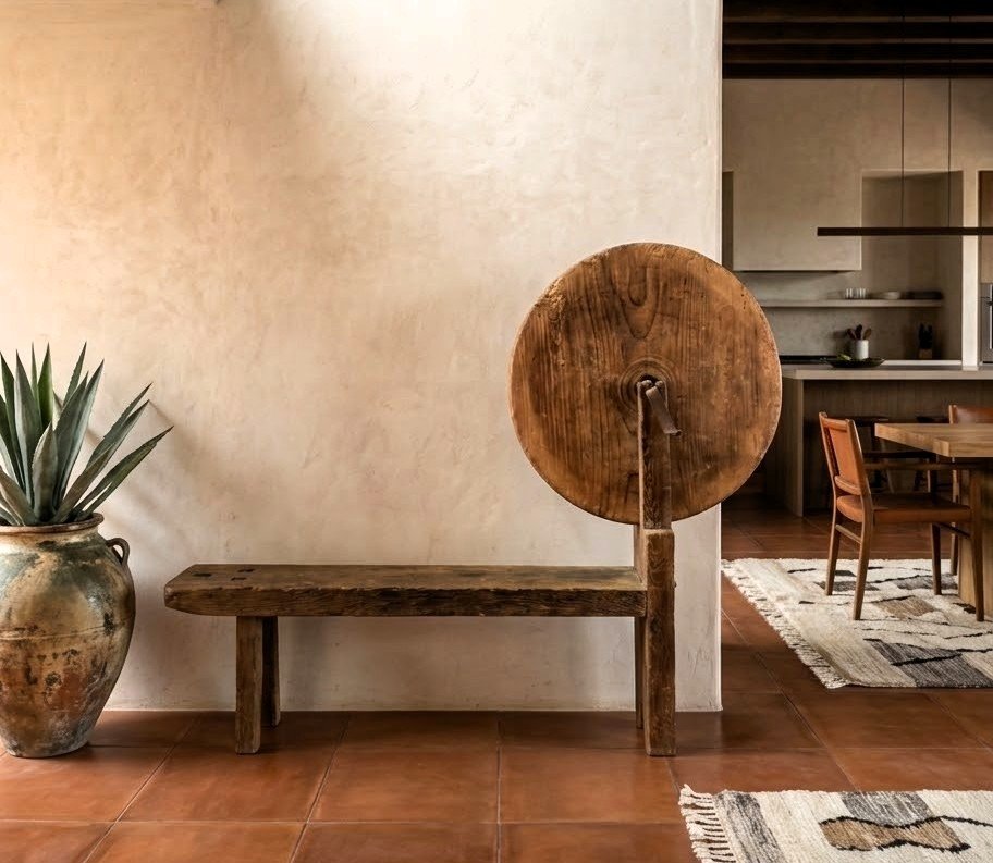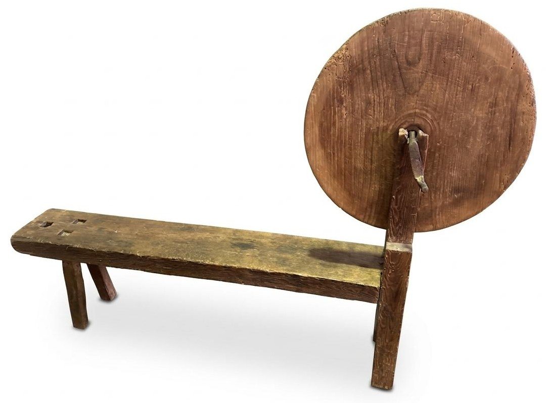 Su diseño se caracteriza por un banco alargado y robusto, sostenido por patas de ensamble rústico, y una gran rueda de madera maciza accionada por una manivela de hierro forjado. Es una pieza ideal para proyectos de interiorismo que buscan un punto focal de estilo rústico refinado, wabi-sabi o de contraste contemporáneo.