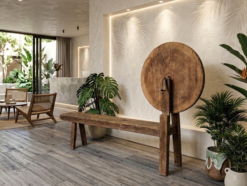 • En hostelería: Perfecta como pieza de bienvenida en el lobby de un hotel boutique o contra una pared de piedra/ladrillo en un restaurante de diseño.