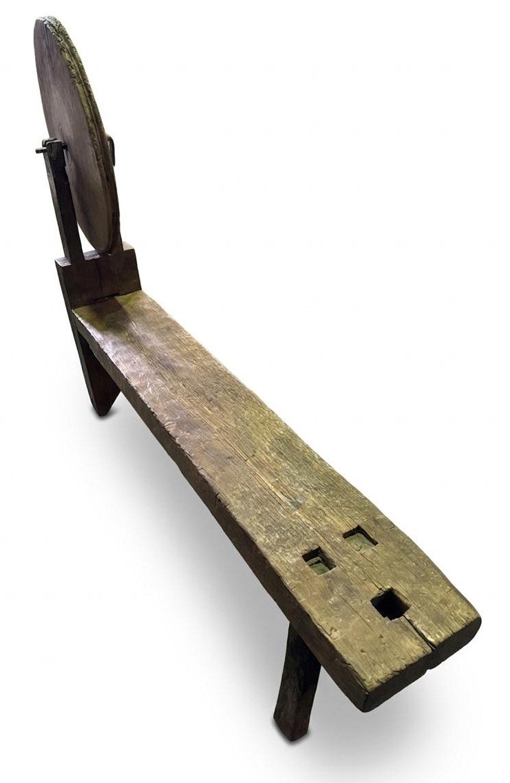 Esta magnífica rueca antigua de banco es una pieza excepcional que combina la funcionalidad histórica con una presencia escultórica imponente.
