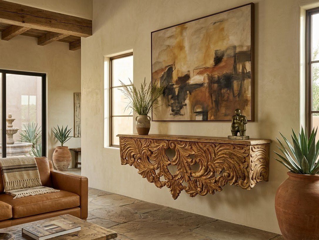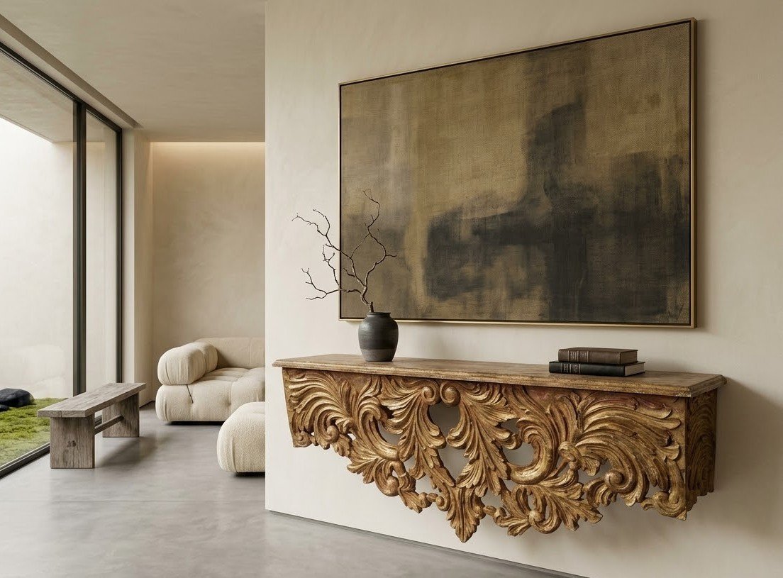 Esta consola flotante es una pieza de declaración que fusiona la opulencia del estilo barroco con la ligereza del diseño suspendido.