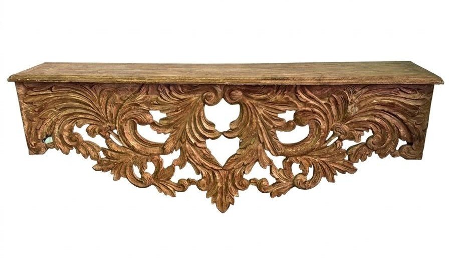 Destaca por su impresionante faldón calado, magistralmente tallado a mano con motivos de hojas de acanto y volutas que aportan un dinamismo visual único. Su acabado envejecido, con sutiles matices en tonos tierra y restos de policromía, realza la profundidad de la talla y permite que la pieza se integre perfectamente tanto en ambientes clásicos como en proyectos de interiorismo contemporáneo que buscan un elemento de contraste histórico.