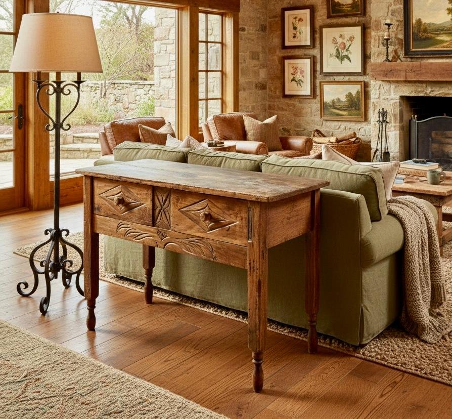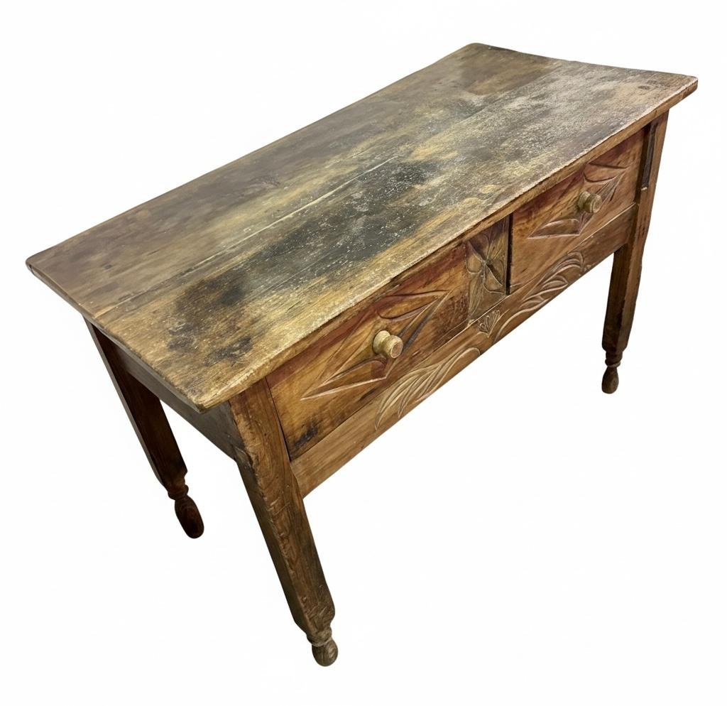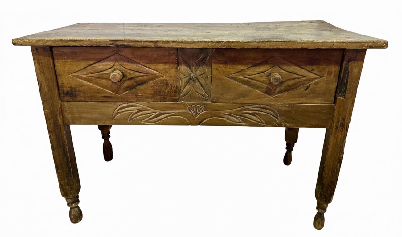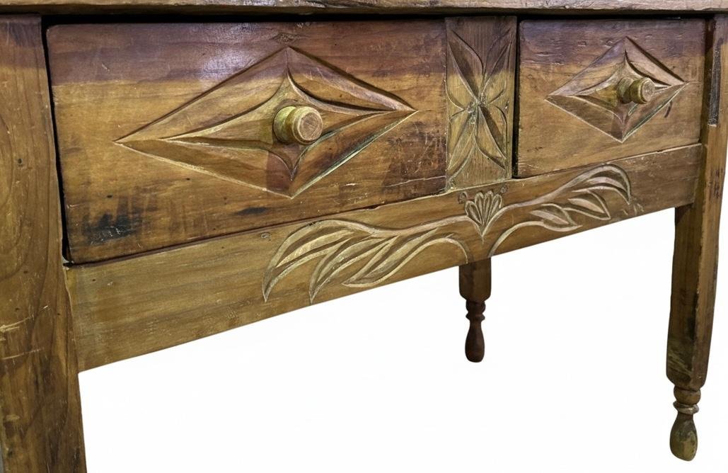 Frontal con dos cajones decorados con tallas en forma de rombo y motivos orgánicos tallados a mano en el faldón. Elegantes patas de estilo clásico que aportan ligereza visual a pesar de su construcción sólida.