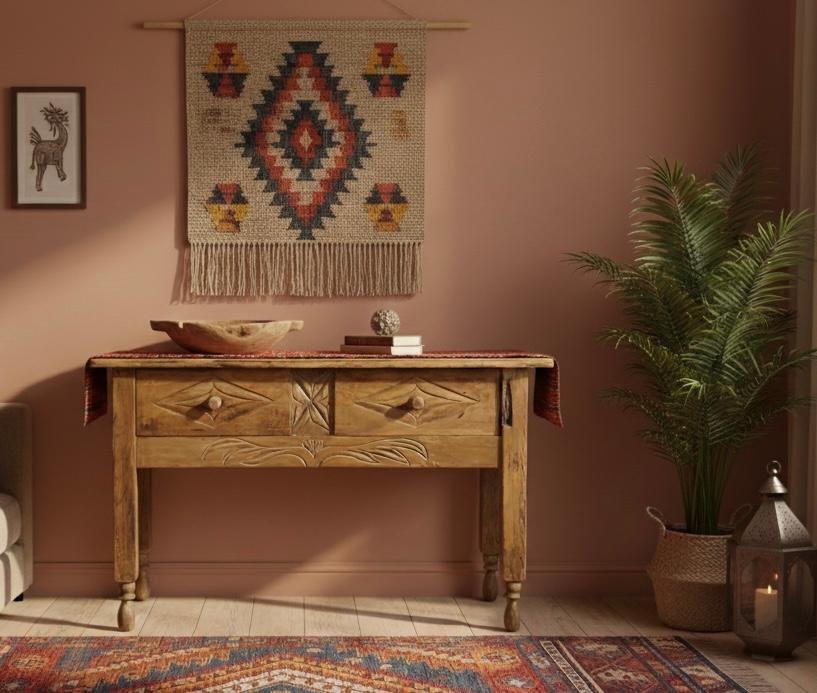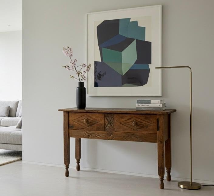 Esta consola destaca por su robustez y su diseño lleno de detalles. Fabricada en madera recuperada, presenta un acabado natural que resalta las imperfecciones propias del material, convirtiendo este mueble en una pieza única. Su frontal trabajado con relieves geométricos y florales la sitúa como el centro de atención de cualquier estancia.