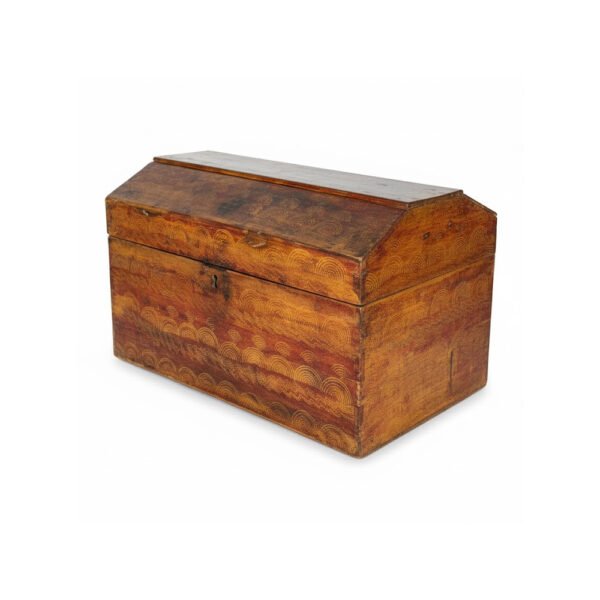 Este baúl de madera es una pieza con historia y una personalidad inconfundible. La superficie del baúl está adornada con un fascinante patrón de arcos concéntricos o semicírculos repetitivos que se entrelazan, creando una textura visual que evoca motivos tribales o folclóricos. Este detalle hace que cada lado del baúl sea una obra de arte. Tapa Abovedada Clásica. La tapa ligeramente abovedada o curvada no solo añade un atractivo estético tradicional, sino que también ofrece un toque de encanto antiguo.
