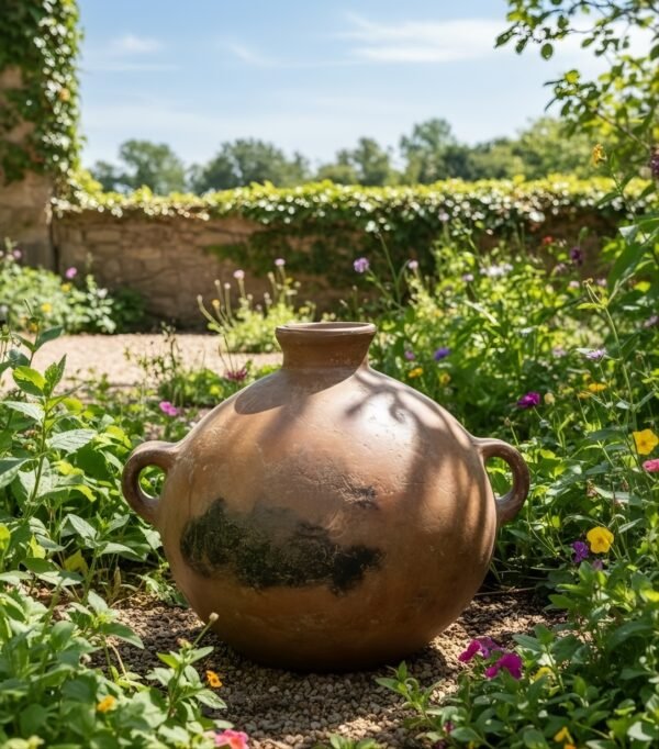 Elaborada en barro cocido con un acabado terroso natural y matices oscuros de la cocción, que le confieren una pátina única y un carácter inigualable. Su silueta redondeada y el cuello estrecho se complementan con dos robustas asas laterales, fusionando funcionalidad y estética.